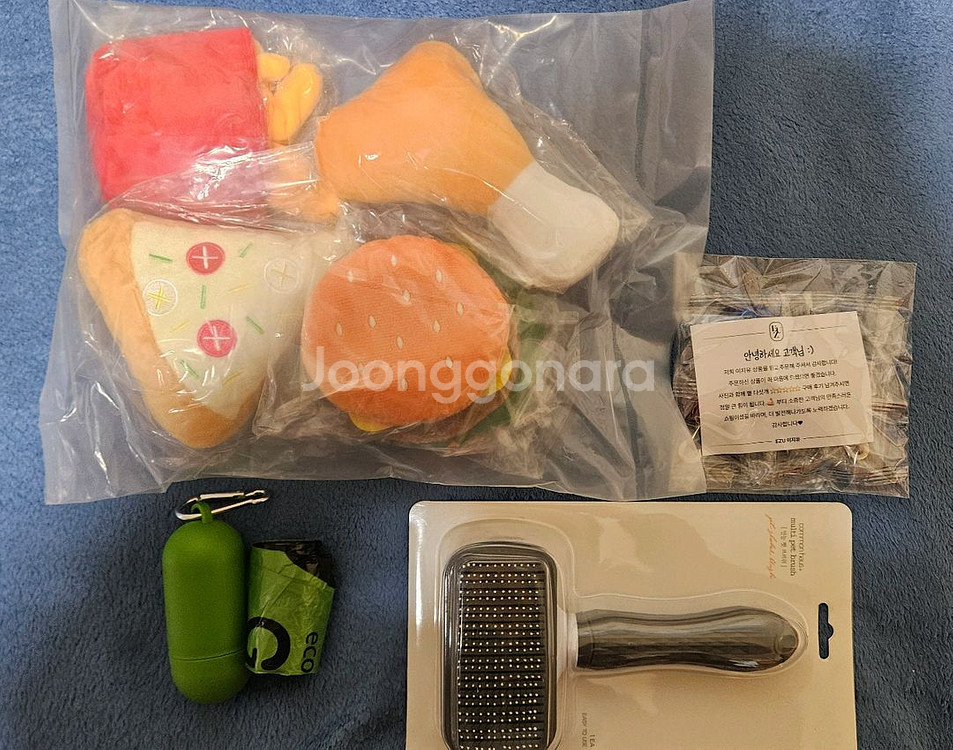 강아지 장난감 새상품, 브러쉬 빗 새거, 배변봉투 본체와 리필 전부 묶어서 팝니다 인형 장난감은 사진 보시다시피 뜯지도않았습니딘 새상품입니다 구매할때 같이왔던 사은품도 안 뜯은 상태로 같이드려요 빗도 보시면 뜯지 않은 새상품입니다 빗 이름은 커먼하우스 만능펫브러쉬 입니다 배변봉투도 한번도 쓰지않은 것이고 구매할때 같이온 리필 도 같이 드려요 다같이 묶어서 판매합니다 일괄로 1만원입니다 택배 가능하고 우체국택배 혹은 GS25반값택배(택배비 추가됨) 이용합니다 안전결제는 이용하지않습니다