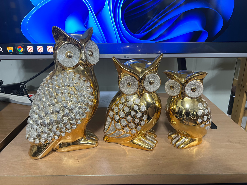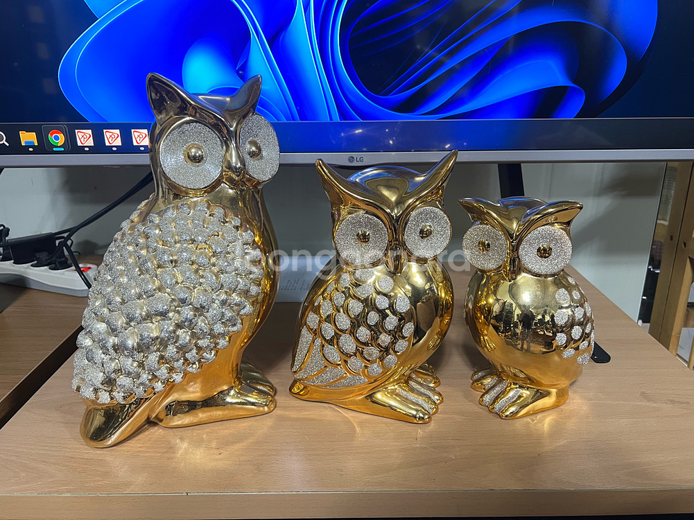 집안에 행운을 가져다줄 금색 부엉이 장식품 3개 세트입니다. 반짝거리는 큐빅 장식이 고급스러움을 더했습니다. 크기가 조금씩 달라서 옹기종기 모아두면 더 예뻐요. 별도 문의 없으시면 바로 안전결제 부탁드려요!