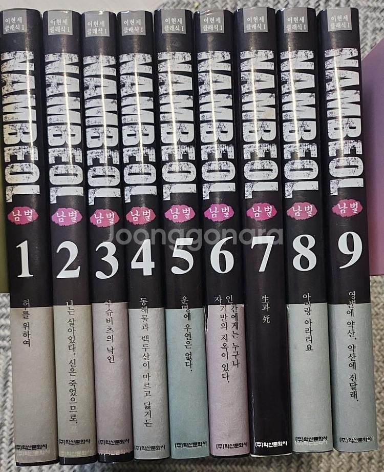 이현세 남벌 클래식 1-9권 세트 판매합니다. 9권 모두 소장하고 있으며, 상태는 사진과 같습니다.초판본이고 6번 띠지 찢김있고 7번 띠지 없음.책 양호. 문의 없으시면 바로 안전결제해주시면 됩니다!