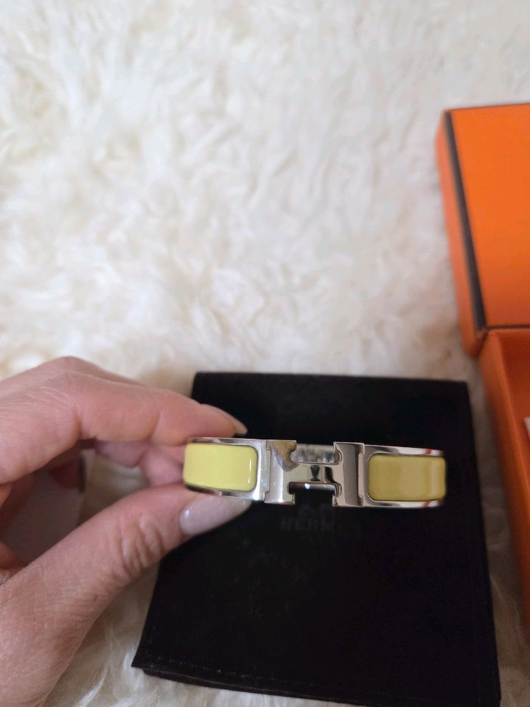 에르메스 클릭아슈 팔찌 PM 옐로우 색상 은장, 감정서 포함 선물 받은지 오래고 보관을 잘못해서 사진 속 H부분에 변색(?) 있습니다 사용감 많으며 변색 부분 등 사진 꼼꼼히 보시고 사진 상태에 동의하시는 분만 구매해주세요 클래식하면서도 세련된 디자인으로 어떤 룩에도 잘 어울립니다 구성품을 가지고 있지 않아 추후 문제될 여지가 없도록 비용 내고 명품 감정도 받아둔 상품 입니다 가급적 직거래 원하며 서울시 마포구에 거주중입니다