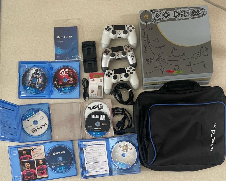 게임 콘솔 프로 본체와 컨트롤러 3개, 게임 타이틀들, 충전기, 전용 가방까지 포함된 완전 세트예요. 상태 매우 양호하고 바로 게임하실 수 있어요! 게임 내장 되어 있고 사진의 보이는게 게임목록입니다. 게임CD도 5-6개 정도 있습니다. 사용하셔도 되고 팔으셔도 됩니다. 내장메모리에 있는 게임이 맘에 드시지 않으시면 다른 게임으로 바꿔드릴겠습니다. 가족 및 친구들과 같이 즐길 실 수 있습니다. 되도록이면 간만 보시지 마시고 사실분만 채팅주세요