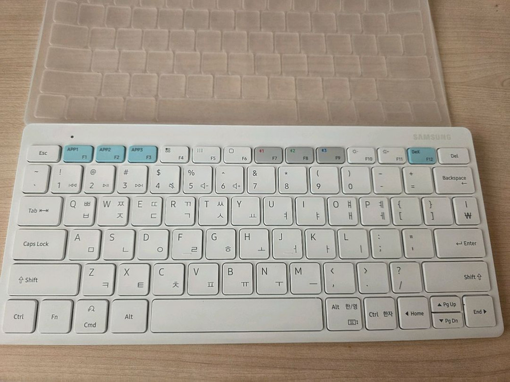 태블릿용 스마트키보드예요. 화이트 컬러로 깔끔하고 실용적이고, 상태도 양호해 보입니다. 태블릿과 연동해서 사용하기 좋은 제품이에요.