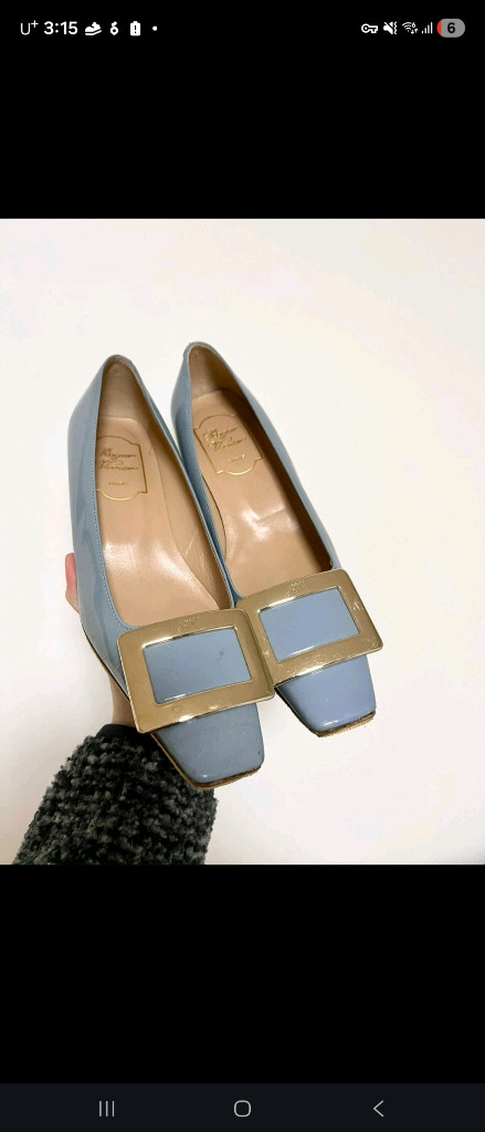 깔끔한 라이트 블루 컬러에 골드 메탈 장식이 포인트인 여성구두예요. 240 사이즈로 상태 양호하고 착용감도 좋습니다. 네고가능입니다