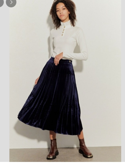 산드로 sandro 벨루아 플리츠 스커트 44 사이즈 정품 사이즈 43호 총장 82 허리반품 31.5 산드로 sandro 네이비 컬러의 고급스러운 스커트입니다 사이즈 43호이고 허리 줄이는 수선해서 44정도이며 두껍지 않은 벨루아 스커트 소재로 봄 가을에 입기 괜찮아요 신축성 있는 소재이고 지퍼 여밈, 안감, 허리쪽 각인된 버튼 장식 디테일 있어요 플리츠 주름 잡혀 있고 은은하게 광택감 느껴지는 벨루아 벨벳 소재로 여성스럽고 우아하게 연출하실 수 있어요 예민하신 분 연락 사양하며 사진 그대로 상태로 컨디션 좋아요