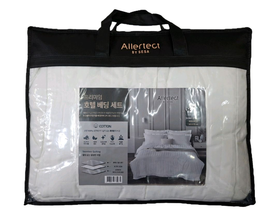코스트코에서 판매하는 "알러텍트 무봉제 호텔 이불세트 퀸(이불1, 베개커버2)"입니다. 제품 상세 사진과 스펙, 사진 참고 부탁드립니다. # 품명 알러텍트 무봉제 호텔 이불세트 퀸(이불1, 베개커버2) # 제품 특징 및 사양 -면 100%로 통기성 우수 -깔끔한 무봉제 타입 -사계절 사용 가능 -색상: 화이트 -사이즈 차렵이불: 200×230cm 베개커버: 40×70cm -구성: 차렵이불 1, 베개커버 2 택배 가능 남양주 별내 직거래 가능