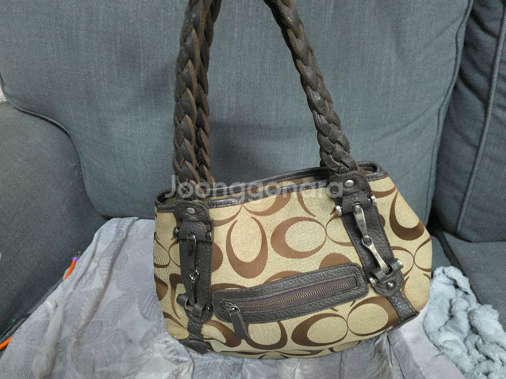 코치 시그니처 숄더백입니다 브라운 색상의 시그니처 패턴이 특징이며, 독특한 꼬임 가죽 핸들이 포인트입니다 앞면에 지퍼 포켓이 있어 수납이 용이합니다 사용감은 있지만 전체적으로 양호한 상태입니다 여기까지가 AI 설명이고 가죽도 사용감외에는 헤진곳없이 깔끔하게 세월이 입혀져 있습니다