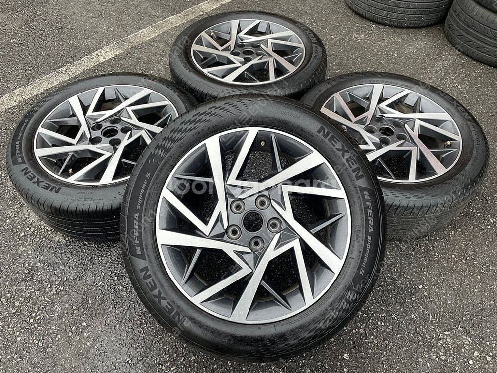 #그랜저 GN7 18인치 순정 휠타이어 세트 팝니다.225 55 18 *휠상태 : 크랙,굴절,기스 전혀 없고 바란스 이상 없습니다.(사진참조) *타이어 : 사이즈는 25 55 18 입니다. 넥센 엔페라 1대분으로 트레드는 70%정도 입니다.(사진참조) 개인차가 있음으로 타이어 바닥면 확인하세요 *위 치 : 화성시 팔탄면 푸른들판로 747 매장 오시면(장착,바란스,공기압) 무상 서비스로 해드립니다. * 대품반납조건가격 : 70만원 입니다. (대품상태 따지지 않으며 없을시 연락주세요) * 문의 : 0 1 0 - 8 8 8 8 - 4 9 9 6