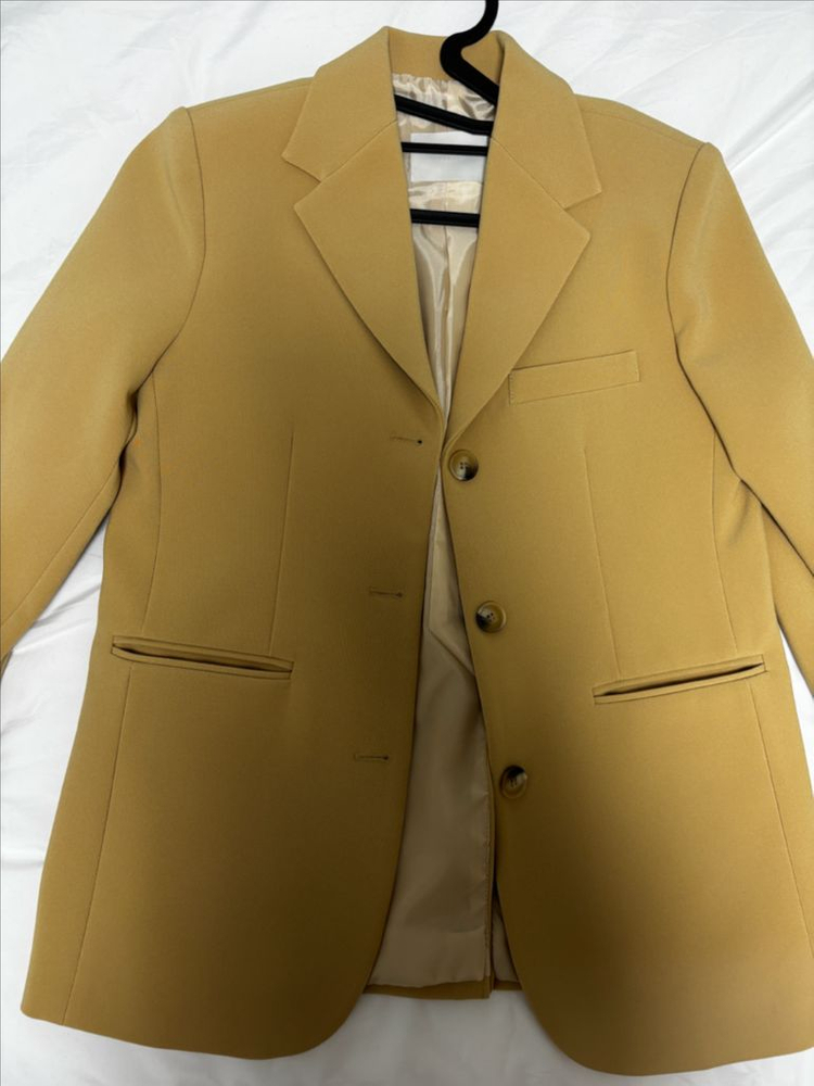 여성자켓으로, 색이 예뻐서 구매했는데 착용만해보고 안어울려서 보관만한 새제품입니다. 오버핏이라 66반 입으시는분들까지 편하게 입으실수있을것같고, 조금 두께감있어 입었을때 탄탄한핏이고 구김도 잘생기지않는자켓입니다.