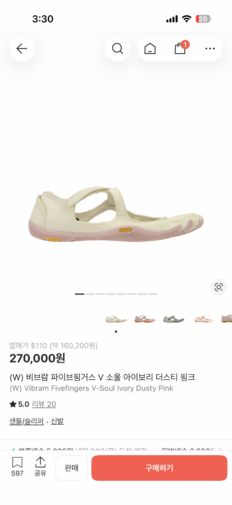비브람 파이브핑거스 V-Soul 아이보리 더스티 핑크 색상입니다 밑창은 분홍색 37 사이즈 구해요 ㅠ 리셀은 안사요..