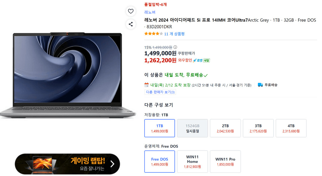 - 상품명 : 레노버 아이디어패드 5i 프로 14IMH 코어 Ultra7 (155H, 32GB, 1TB+ 2TB) - 사양 : 첨부 사진 참고 (SSD WD 740 2TB 추가 장착했습니다.) - 사진과 같이 외부에 살짝 사용감 있습니다. 택배 가능하고, 직거래는 마천에서 가능합니다. 안전거래는 죄송하지만 사양합니다. 잘부탁드립니다.