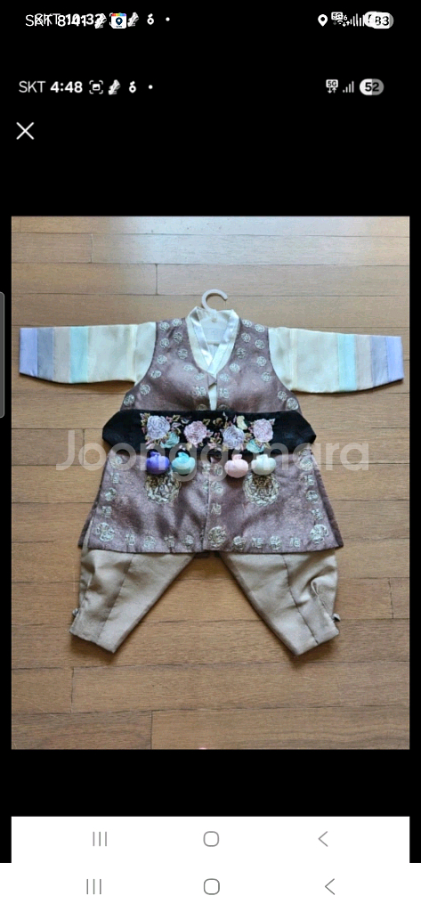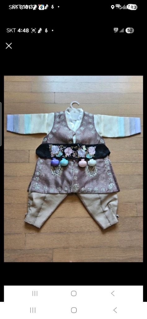 남아용 한복 세트로 저고리, 바지, 조끼가 포함되어 있어요. 전통적인 디자인에 예쁜 색감으로 구성되어 있고, 상태도 깔끔한 편입니다. 특별한 날이나 명절에 입히기 좋을 것 같아요.
