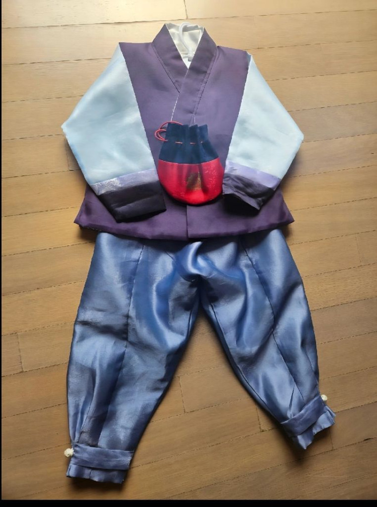 남아용 한복 상하의 세트예요. 저고리는 보라색 바탕에 꽃무늬 장식이 있고, 치마는 연한 파란색으로 되어있어요. 전체적으로 깔끔한 상태로 보관되어 있습니다.