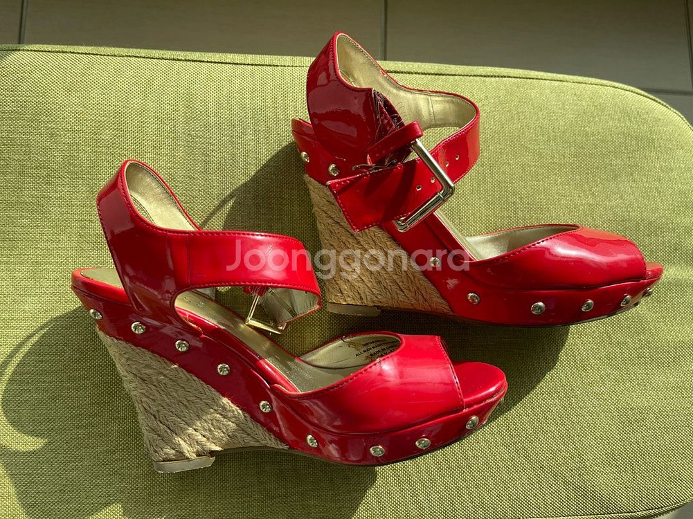 Guess 빨간색 웨지힐 샌들입니다 에나멜 재질에 앞코가 오픈되어 있고, 발목에 버클 스트랩이 있습니다 스터드 장식이 포인트로 들어가 있습니다 굽이 높아 다리가 길어 보이는 효과가 있습니다 전체적으로 사용감은 있지만, 특별한 하자는 없습니다