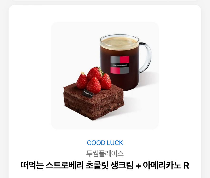 투썸플레이스 스초생 + 아메리카노 R 세트 원가:11900원 유효기간: 2027년 1월 2일 *교환,환불 불가 송금 시 기프티콘 사진 보내드립니다