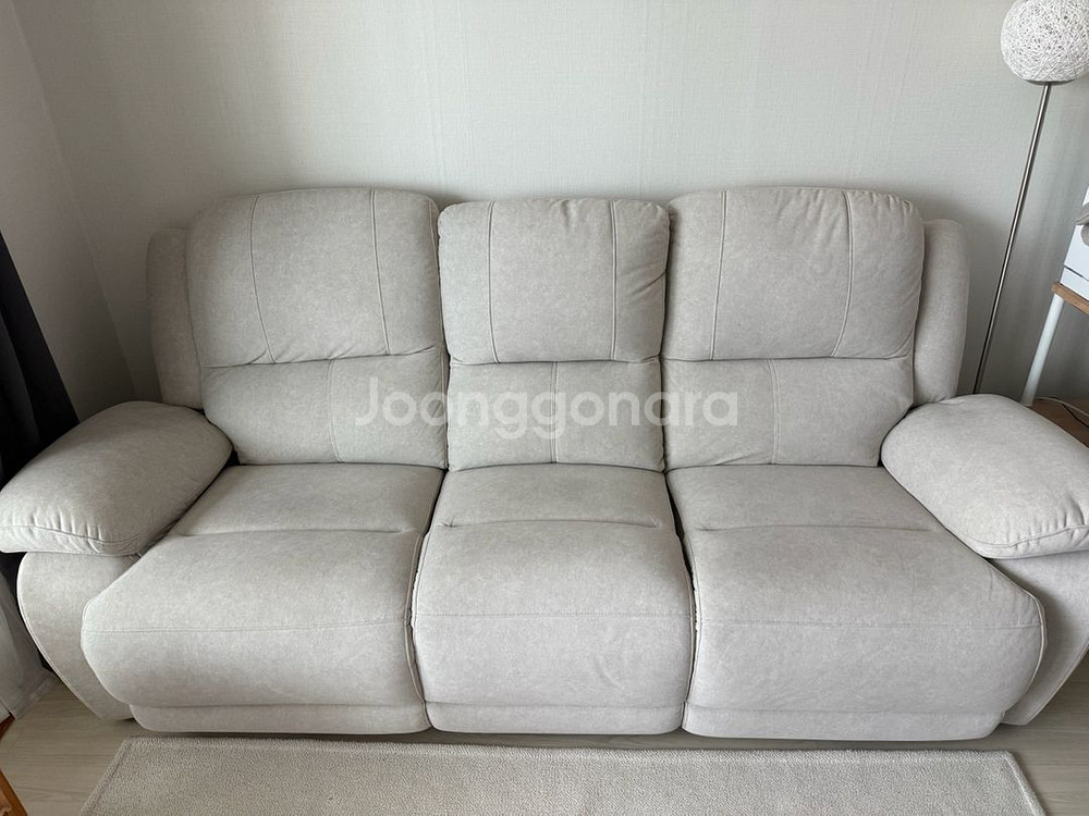 아이보리 색상의 3인용 리클라이너 소파입니다 - 버튼으로 리클라이닝 각도 조절이 가능합니다 - 편안한 착석감으로 휴식을 취하기 좋습니다 - 컵홀더가 있어 음료를 편리하게 보관할 수 있습니다 - 인테리어에 잘 어울리는 디자인입니다 2024년 100만원 정도에 구매하고 1년 좀 넘게 사용했습니다. 보이는 때나 큰 생활감 없이 잘사용했습니다. 세칸 분리가 가능해서 가져가시는데 수월하실거에요!