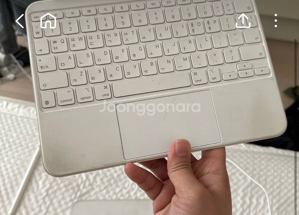 태블릿용 매직키보드입니다. 화이트 컬러로 깔끔하고 사용감은 있지만 기능상 문제없이 잘 작동해요. 태블릿과 함께 사용하면 노트북처럼 활용 가능합니다.