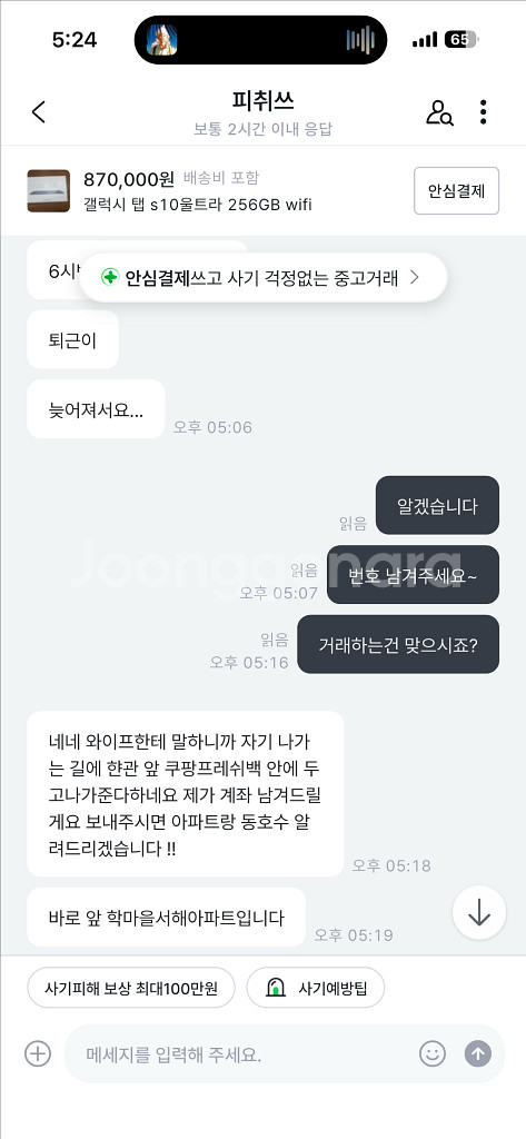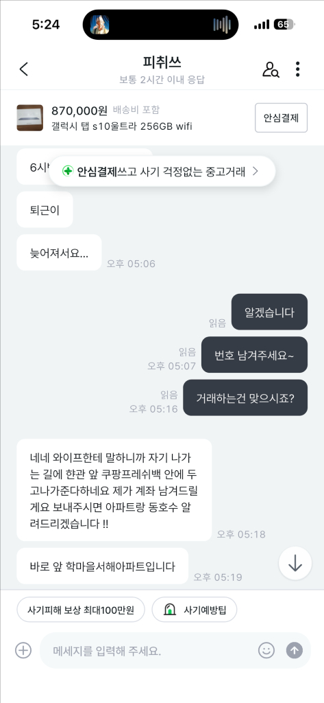 개인정보(거래정보)를 주고받는 행위는 사기에 노출될 수 있으므로 즉시 중고나라로 신고해 주세요피취스 이사람 직거래하자더니 약속시간에 갑자기 한시간 반이나 늦는다고 말함 기다리겠다고하면 돈먼저보내라고 헛소리하니까 조심하세요!!