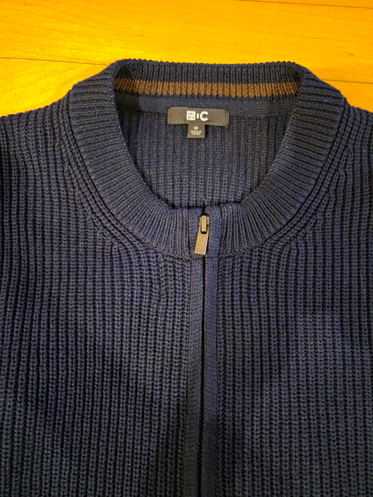 유니클로 C 라인 크루넥풀집업 니트입니다 색상은 네이비이고, 부드러운 촉감과 보온성이 좋아요
