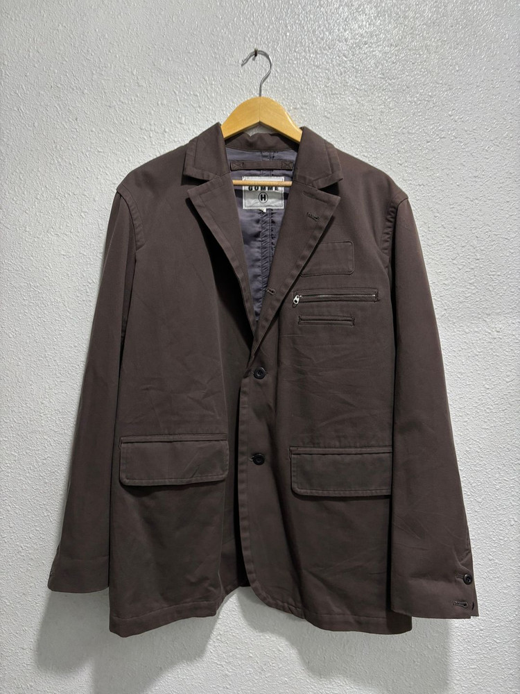 일본 브랜드 GOMME(고무)의 남성라인 GOMME HOMME 개체입니다. Gomme는 요지 야마모토(Yohji Yamamoto)의 디자이너 히로시게 마키가 1989년 설립한 브랜드입니다. 드레이핑, 오리가미 등 다양한 기법을 사용한 컬렉션을 현재까지도 보여주고 있습니다. GOMME HOMME는 테일러드 기반에 일본 특유의 실험적인 디테일을 더한 컨템포러리 남성복 라인으로 알려져 있습니다. 블레이저를 베이스로 한 디자인에 목 부분을 버튼으로 잠글 수 있는 컨버터블 칼라(스탠드 칼라 연출) 디테일이 적용된 자켓입니다. 오픈하면 클래식한 블레이저 느낌으로, 라펠을 세워 잠그면 요즘 트렌드에 맞는 일본 브랜드 특유의 미니멀한 무드로 착용 가능합니다. 가슴 지퍼 포켓과 플랩 포켓 등 디테일이 과하지 않게 구성되어 있으며, 차분한 팥색 컬러감의 톡톡한 면소재로, 데일리로 활용하기 좋습니다. <실측(cm)> - 어깨 : 49 - 가슴 : 56 - 소매 : 64 - 총장 : 79