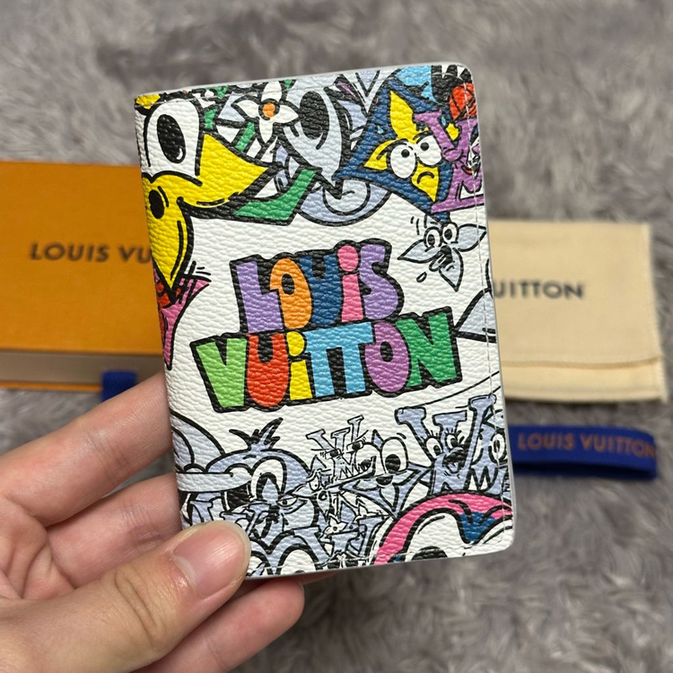 루이비통 한정판 코믹스 지갑입니다. 사진에서 보시다시피 밝은 색상임에도 불구하고, 관리가 잘 되어 때탐이나 변색 없이 깨끗한 상태입니다. 내부는 연보라색이며, 상태 매우 좋습니다. 모서리 까짐도 일절 없습니다. 구성품 다 있습니다. 연락주세요.