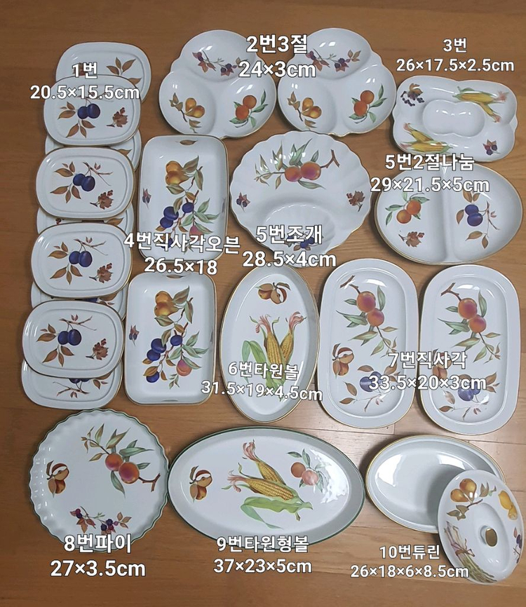 영국 로얄우스터 이브샴 골드 오븐 플레이트 단종된 디자인입니다. 섬세한 과일 그림과 금장 장식이 고급스러움을 더합니다. 1971년 영국 도자기 최초 본차이나 도자기를 만든 유명한 회사랍니다 요즘은 방글라데시 에서 생산되고 영국산은 단종되어 귀한 아이들이예요 오븐에서 식탁으로 바로 올려놓을수 있어 매우 편리하고 거의 사용감 없이 보관용으로 상태 거의 새거수준 입니다 다양한 모양 준비되어 있으니 사진상의 번호 확인하시고 문의주세요. ※모두 개당값입니다 ※※52290089※※※※※※※※ 1.샌드위치접시20.5×15.5cm₩23000>3개남음 2.3절접시 24×3cm ₩45000 3.센타소스볼26×17×2.5cm₩40000 4.사각서빙볼26.5×8×4cm₩58000 5.조개볼 28.5×4cm₩55000 5.2절나눔 29×21.5×5cm₩60000 품절 6.타원볼31.5×19×4.5cm₩65000 7.직사각서빙33.5×20×3cm₩65000품절 8.이브샴베일파이볼 27×3.5cm₩60000 9.이브샴베일타원형37×23×5cm₩75000 10.타원형튜린26×18×6×8.5cm₩65000품절 [네이버 블로그] 블로그를 소개합니다. skn00899의블로그 | 미쎄스신컬렉션 https://m.blog.naver.com/skn00899 ※매너거래 해주세요. ※반품환불.네고 예민 정중히 사양합니다. 택배 가능합니다