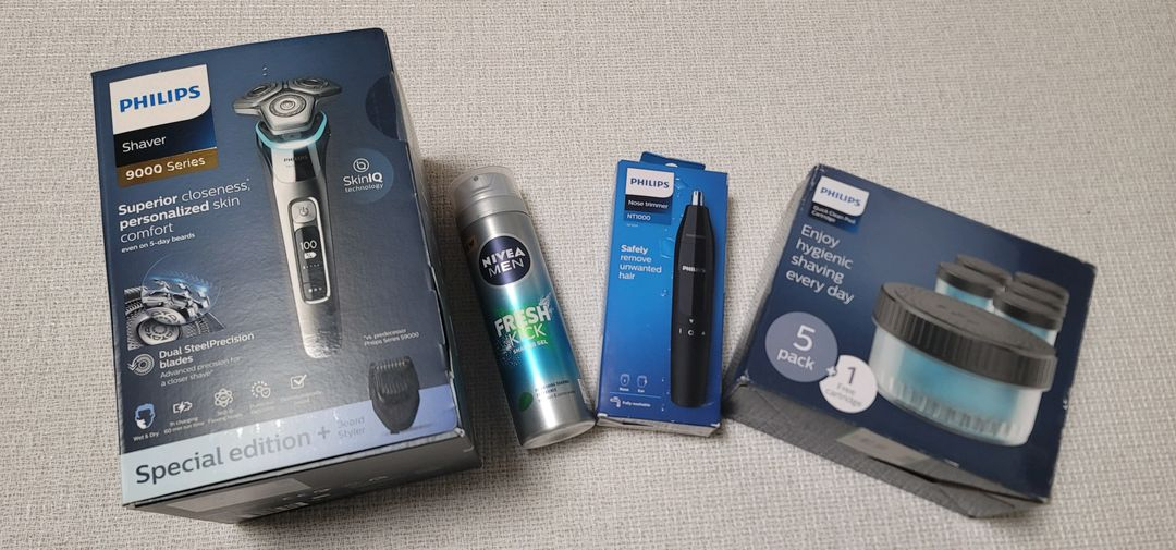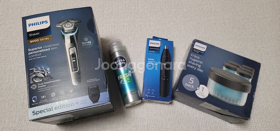 미개봉) 필립스 전기면도기 S9000 면도기 새제품 s9985 사진 구성품 전부. 무료배송 정품 필립스 S9985/59 필립스 CC16/51 필립스 코털 트리머 니베아 쉐이빙 젤