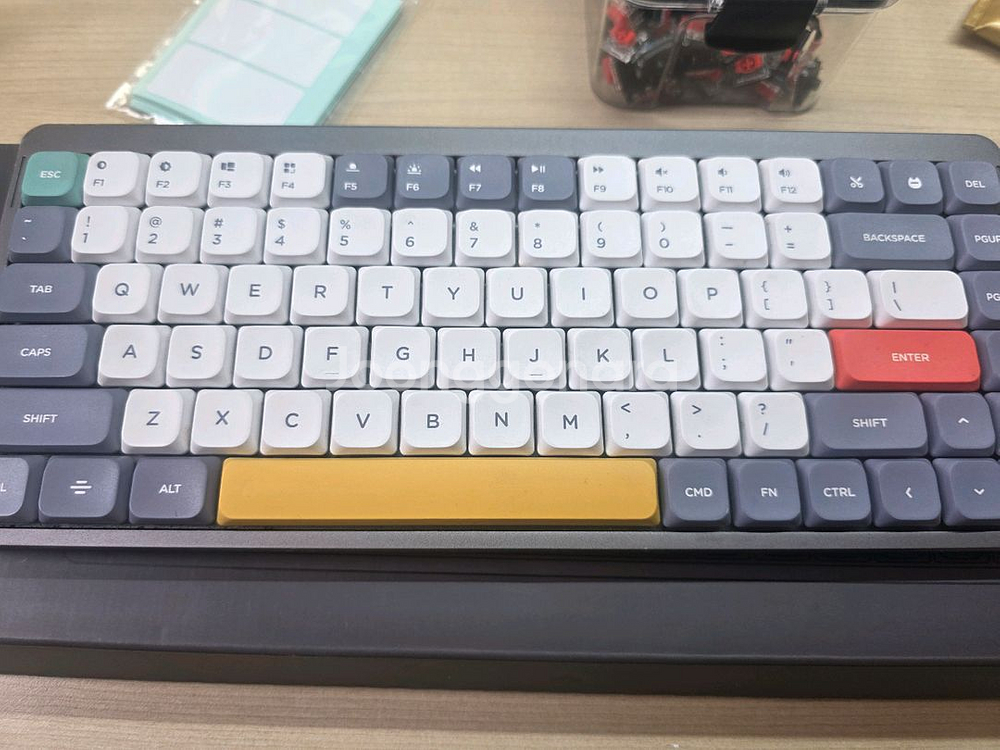 Nuphy Studio의 Air75 기계식 키보드입니다 - 16mm 초박형 디자인으로 휴대성이 좋습니다 - 4000mAh 배터리 용량 - 로우 프로파일 기계식 스위치 - 게이트론 로우 프로파일 적축 스위치 포함 - PBT 키캡 - RGB 사이드라이트 테두리 까짐 등 사용감은 있어요 적축 스위치 여분 키캡 포함