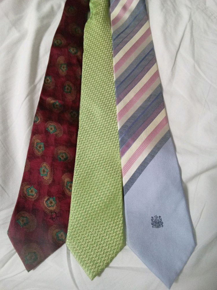 디올, 장미빛에 개화하는 꽃순 패턴 무늬 입니다 8.8cm 택포 3.5 아쿠아텀 , 경쾌하고 시원한 사선 패턴 8.8cm 택포 2.0 밀라숑, 발고 테크니컬한 연두색에 쇄기 패턴 이라 그냥 컬러 그대로 즐기시기 좋습니다 8cm 택포 2.0 세개 모두 1ㅡ2 회 착용후 어울리지 않아 접어둔 상태라 깨끗 합니다