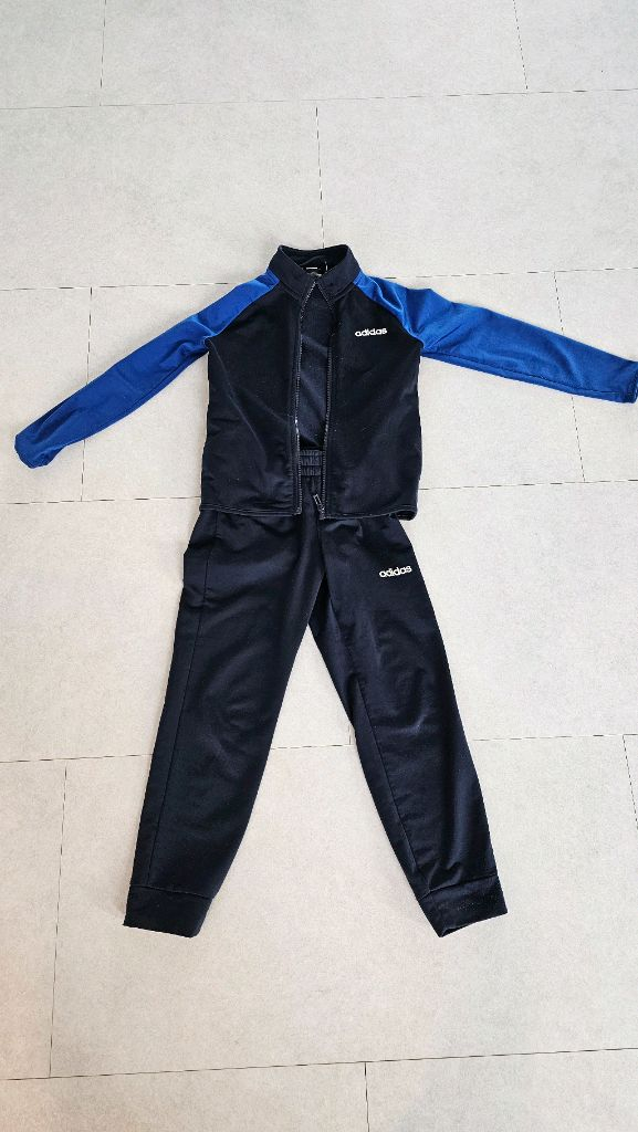 아디다스 정품 아동용 운동복 세트예요. 상의와 하의로 구성되어 있고 네이비와 블루 배색이 예뻐요. 전체적으로 깔끔하지만 예민하신분은 피해주세요 정사이즈로 나왔습니다 120대 아이에게 잘 맞을겁니다