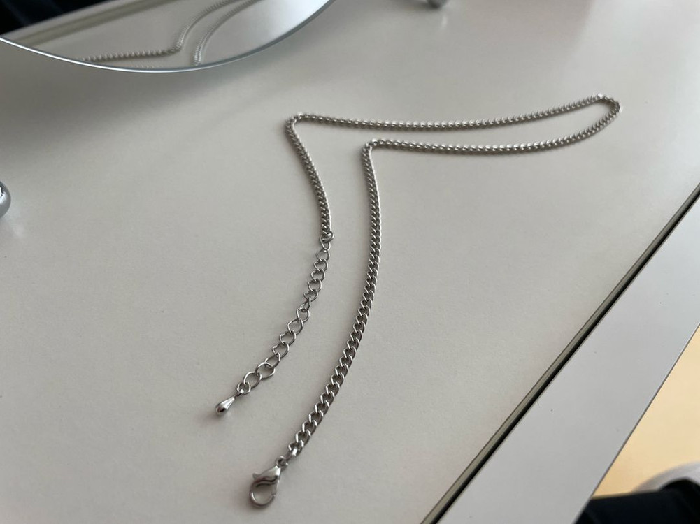 변색 알러지 걱정 없는 써지컬 소재 실버 체인 목걸이 입니다 상태 새것처럼 깨끗합니다 총장 47cm이고 길이 조절가능해요 무신사에서 구매했는데 브랜드명이 기억나질 않네요 팬던트 따로 달아서 착용해도 좋습니다 :)