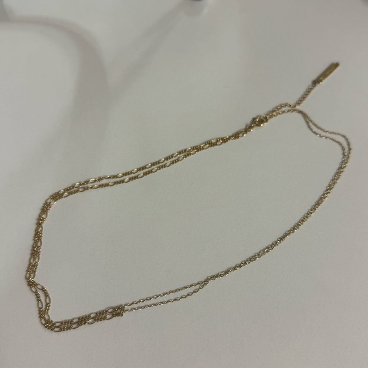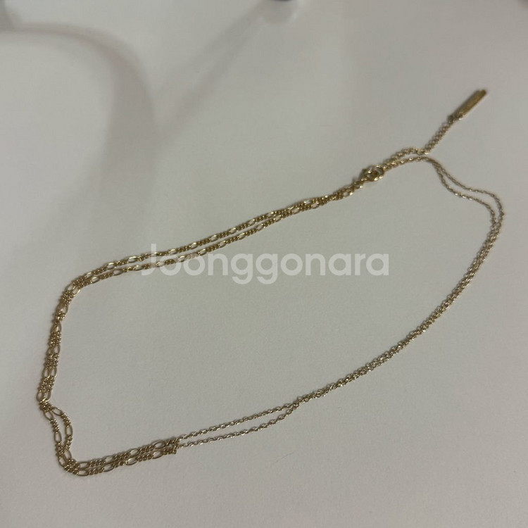 오델리프레 트위드 네크리스입니다. 두 가지 체인이 엮여 만들어진 스타일로, 은은하면서도 포인트가 되어 어디에나 매치하기 좋아요. - 재질: Silver 925 금 도금 - 사이즈: 총 길이 38cm, 연장 길이 5cm - 구매 가격은 52,000원입니다 골드 색상입니다 1회 착용으로 거의새것 입니다 다른 목걸이와 레이어드 해도 좋아요