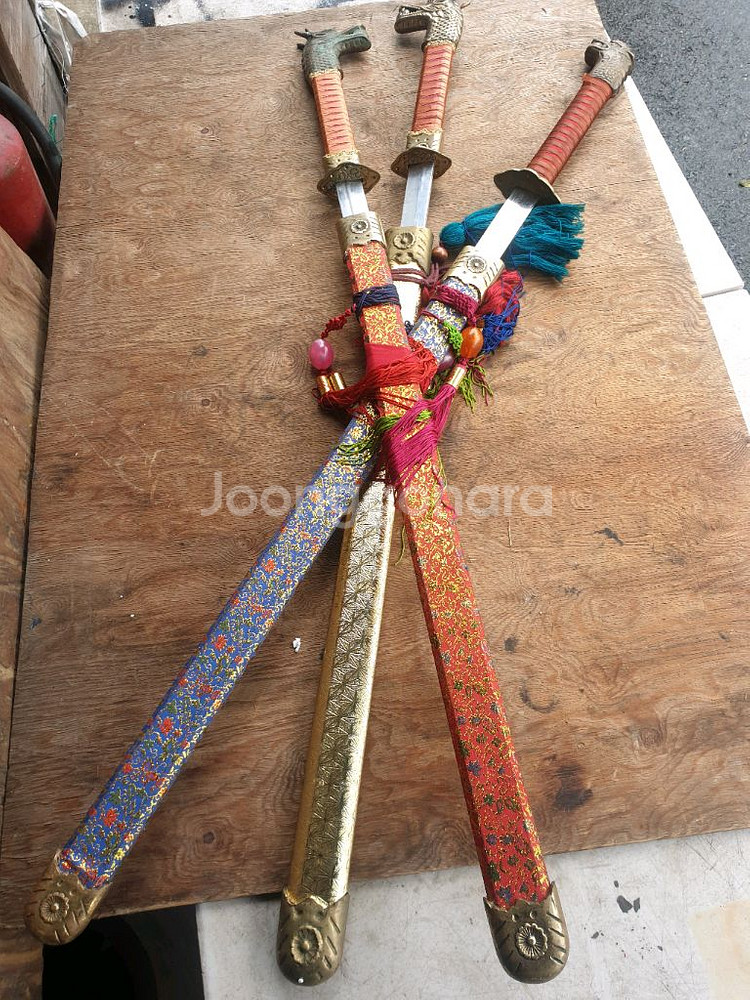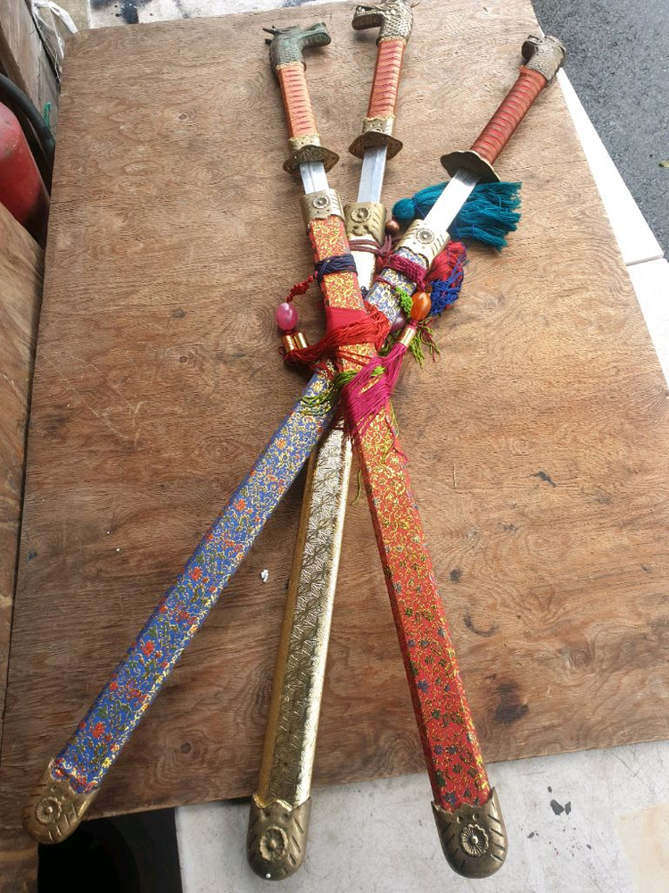 황동으로 장식된 칼 세 자루 판매합니다. 용 문양 조각이 칼자루에 정교하게 새겨져 있습니다. 칼집도 화려한 색감으로 디자인되어 있어 장식용으로 좋습니다. 문의 없으시면 바로 안전결제해주시면 됩니다!