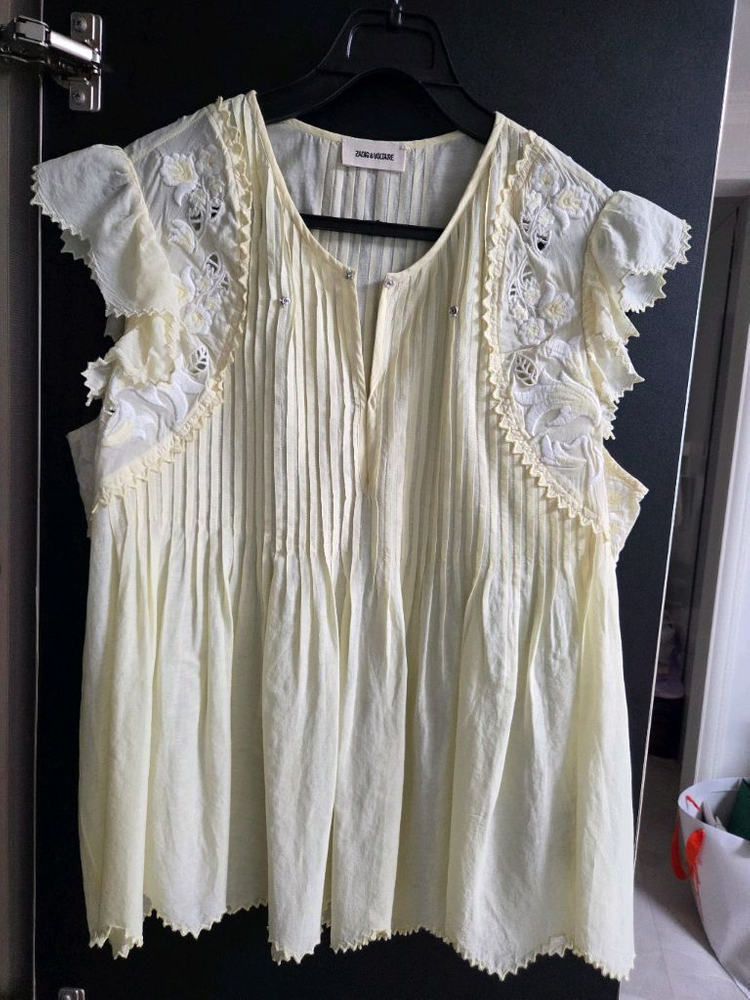 쟈딕앤볼테르 레이스 반팔 블라우스 정품 인천롯백에서 459,000 구입후 시착만하고 그대로 보관요 연한 노랑색 레이스 블라우스예요. 어깨 부분에 섬세한 레이스 디테일과 플리츠가 예쁘고, 가슴골라인에 후크 달고 브이넥원해서 양쪽 똑딱이 달았어요. 밑단 또한 독특하게 이쁘고 고급저요 봄 여름 코디하기 좋은 아이템이에요! 사이즈 M 55~66 총기장 60cm 구매원하시면 연락주세요 신중하게구매 부탁드릴께요 취소 반품불가입니다 중고제품 예민하신분은 매장에서 구매 부탁드릴께요 010 9260 9001
