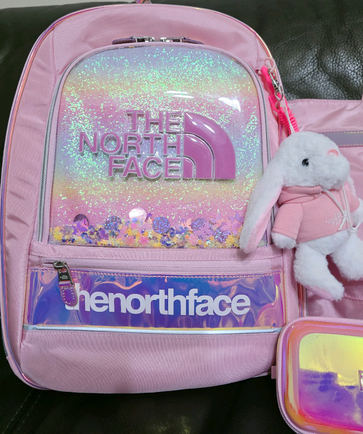노스페이스 저학년 책가방, 토트백, 필통 세트입니다. (정가 209,000원) 은은한 핑크색에 반짝이 포인트가 있어서 아이들이 정말 좋아할 것 같아요. 세트로 구매해서 같이 들고 다니면 더 예쁘답니다! 저렴한 가격에 빨리 득템하세요! (교환 환불은 불가하오니 신중히 고려해서 구매하세요~♡)