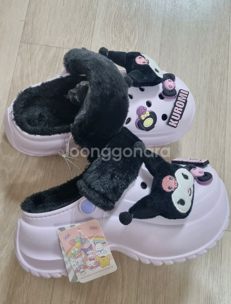 새상품. 쿠로미 털 크록스 슬리퍼입니다~ 사이즈230굽 있는타입으로 여성스럽고 인형부자재도 고급스럽고 푹신한 털 안감으로 따뜻하게 잘나왔어요