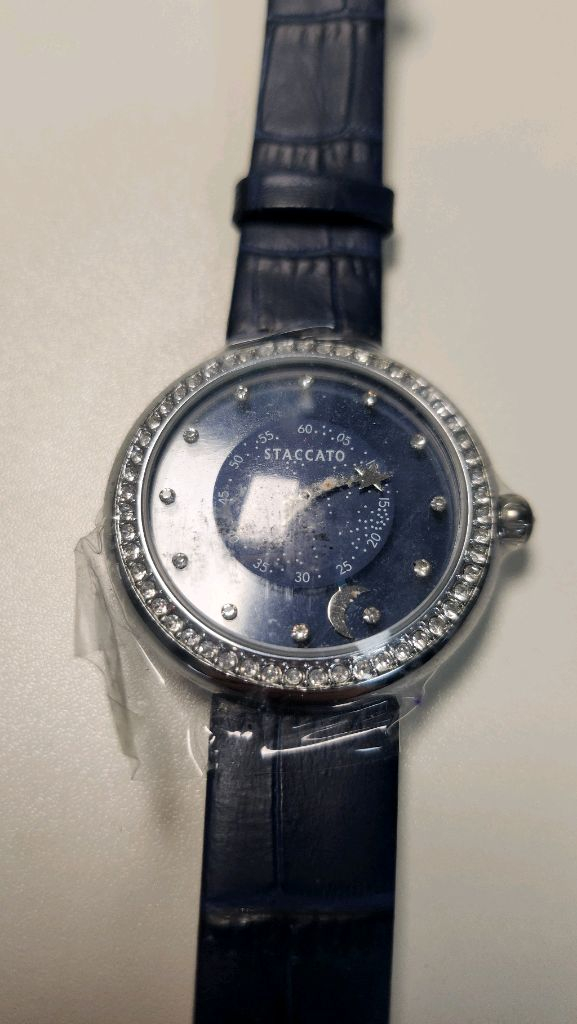 Staccato 여성용 손목시계입니다 블루 색상의 가죽 스트랩과 큐빅 장식이 포인트입니다 세련된 디자인으로 패션 아이템으로 활용하기 좋습니다 실착용은 안해서 유리부분 스티커 그대로이나 보관때문에 시계 차는 부분 긁힘이 사진처럼 있고 시계약도 넣어주셔야합니다 택배비 미포함입니다