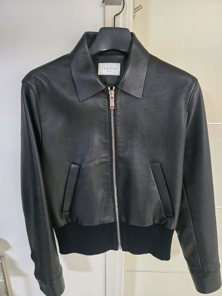 Sandro 가죽 자켓입니다 블랙 색상이고 사이즈는 M입니다. 남성복이나 슬림한 제품입니다.(실측 어깨 46, 총장 64) 상태는 A급으로 매우 좋습니다. ※ 정품 맞으나 구매내역 확인 불가
