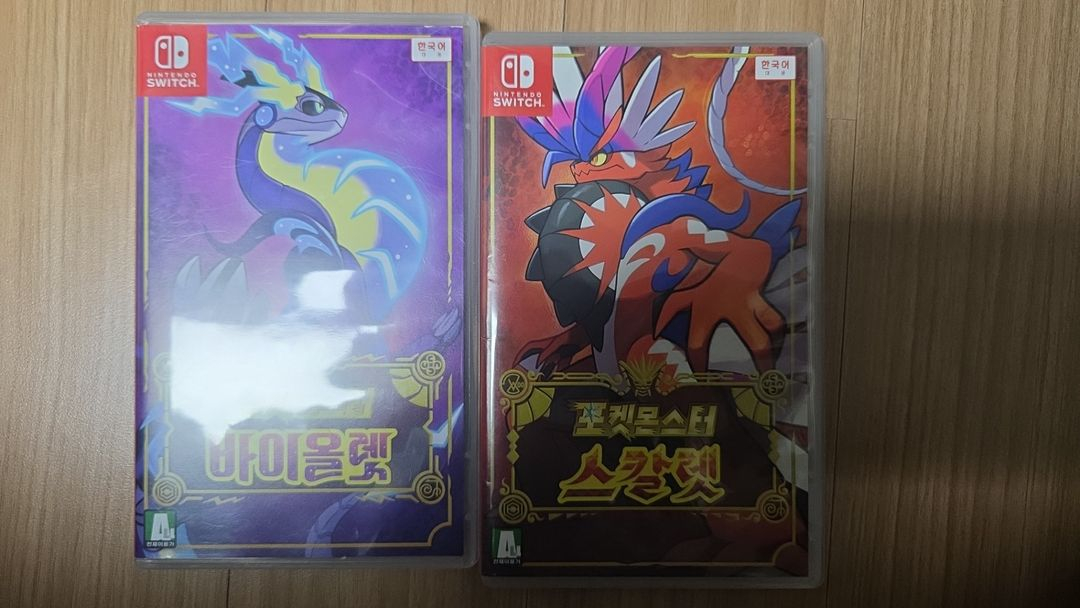 스위치 포켓몬스터 바이올렛과 스칼렛 게임팩 2개입니다. 케이스 상태 양호하고 깨끗한 편이에요. 포켓몬 팬이라면 놓칠 수 없는 아이템들입니다!