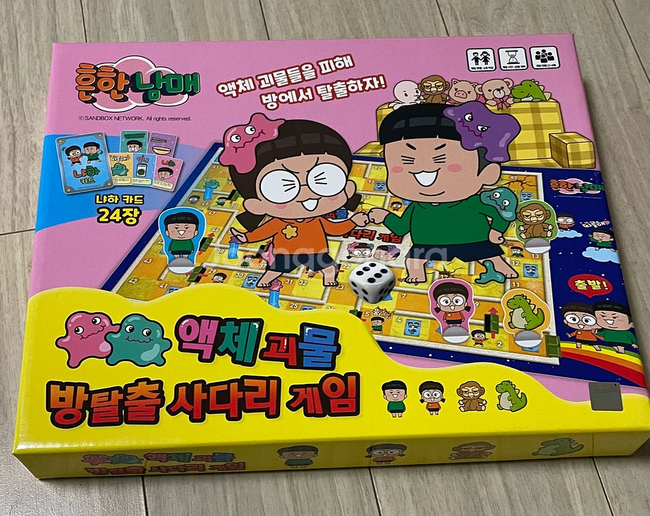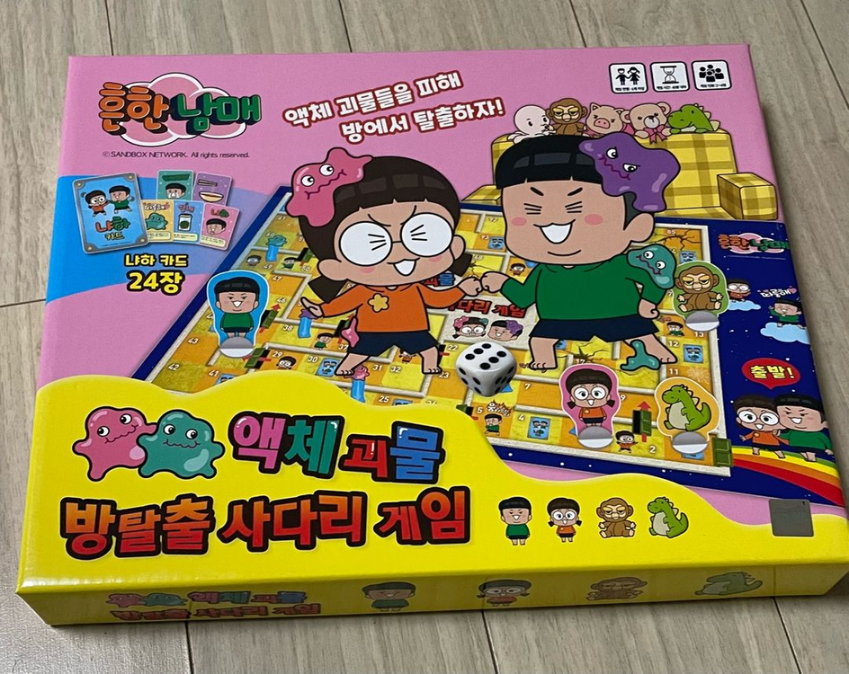 흔한남매 액체괴물 방탈출 사다리 게임입니다. 2~4인용으로 온 가족이 즐겁게 즐길 수 있습니다. 액체 괴물들을 피해 방에서 탈출하는 게임입니다 구입 후 몇번 안해서 깨끗합니다. 구성품도 다 있어요.