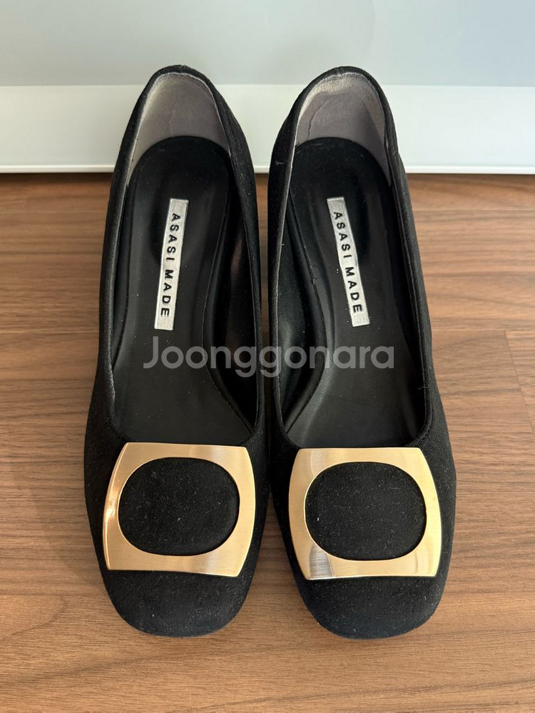 고급스러운 스웨이드 재질의 여성 구두입니다. 검정색 갑피에 금색 버클이 포인트로 달려 있습니다. 특별한 날 포인트 주기 좋은 디자인입니다. 거의 새 제품이라 보시면 되요. 반택, 착불 택배 가능해요.