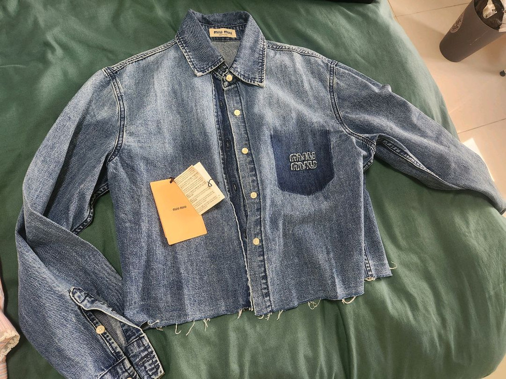 미우미우 청남방 판매합니다. M사이즈이고, 기장이 크롭기장으로 나온 셔츠입니다. 사진 최대한 자세히 찍었습니다.! 44-55입는 저는 넉넉한 핏으로 맞았습니다(사진참고) 지인한테 선물받은 제품입니다, 2025년 가을신상이라고 들었습니다" 제가 좋아하는 스타일은 아니라 팝니다 정확한 판매처는 모릅니다. ● 가격보고..문의주세요; 확실한 정품이 중요하신분들은 온라인이나 매장에서 구매해주세요;