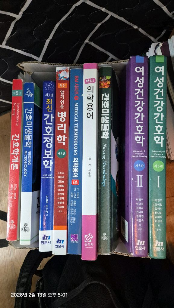간호학과 필수 교재들을 일괄 판매해요! 의학용어, 간호미생물학 등 다양한 전공서적이 포함되어 있습니다. 사용감은 있지만 공부하기에는 문제없는 상태예요. 각 권당10000원이구요 기본간호와 간호정보학는 7000원입니다. 반품과 환불은 안됩니다