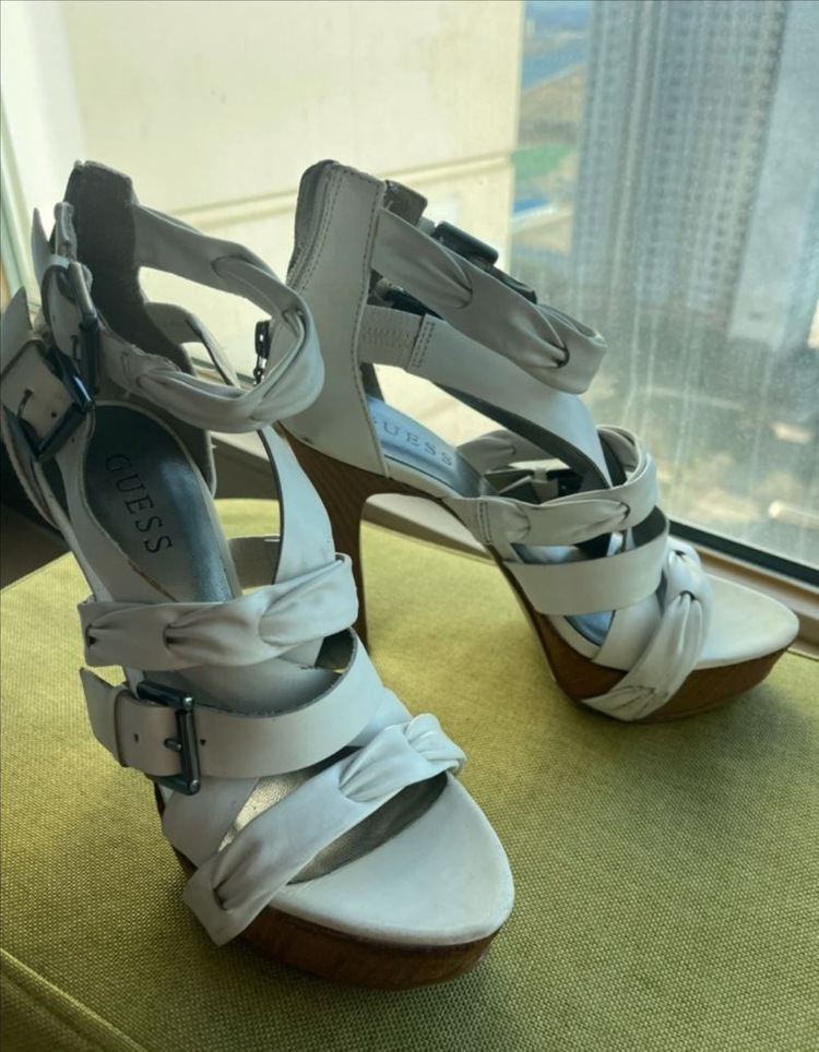 GUESS 흰색 샌들힐입니다 사이즈는 6M입니다 글래디에이터 스타일로 화이트의상이나 데님의상으로 코디하시면 멋집니다 소가죽입니다