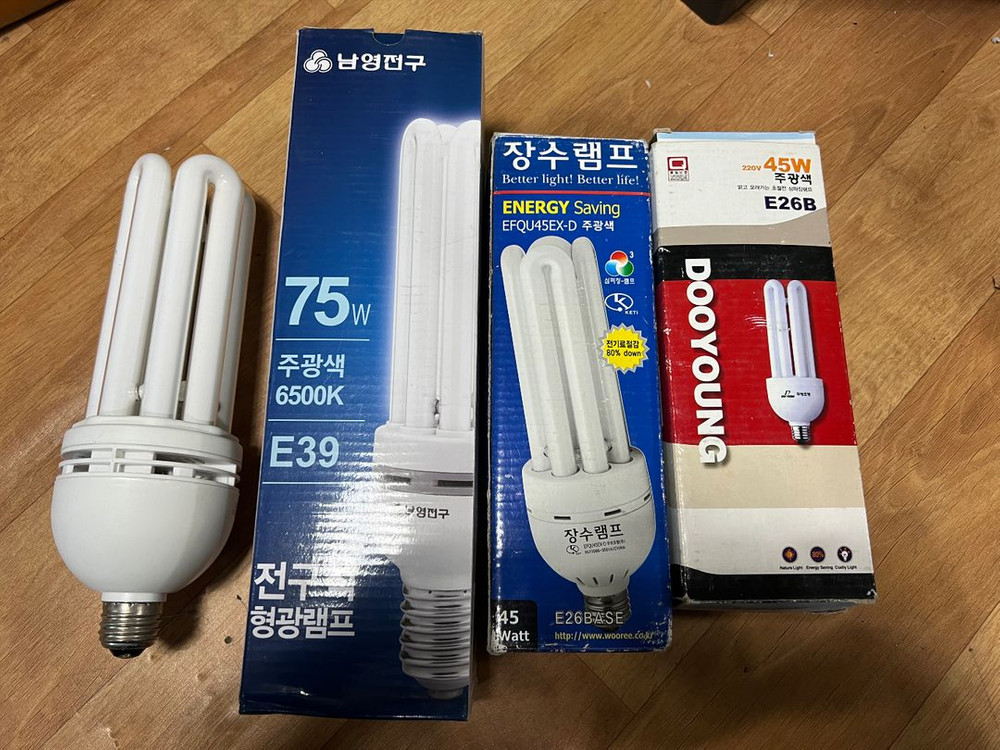개인정보(거래정보)를 주고받는 행위는 사기에 노출될 수 있으므로 즉시 중고나라로 신고해 주세요남영전구, 장수램프, 두영 램프 E26 E39 형광등 판매합니다. 남영전구는 75W, 장수램프는 45W입니다. 두영 램프는 섬세한 조명이 필요한 곳에 적합합니다. 문의 없으시면 바로 안전결제해주시면 됩니다! 일괄 가격 입니다