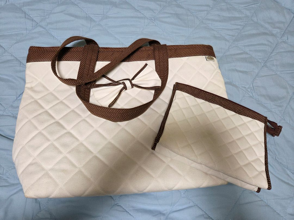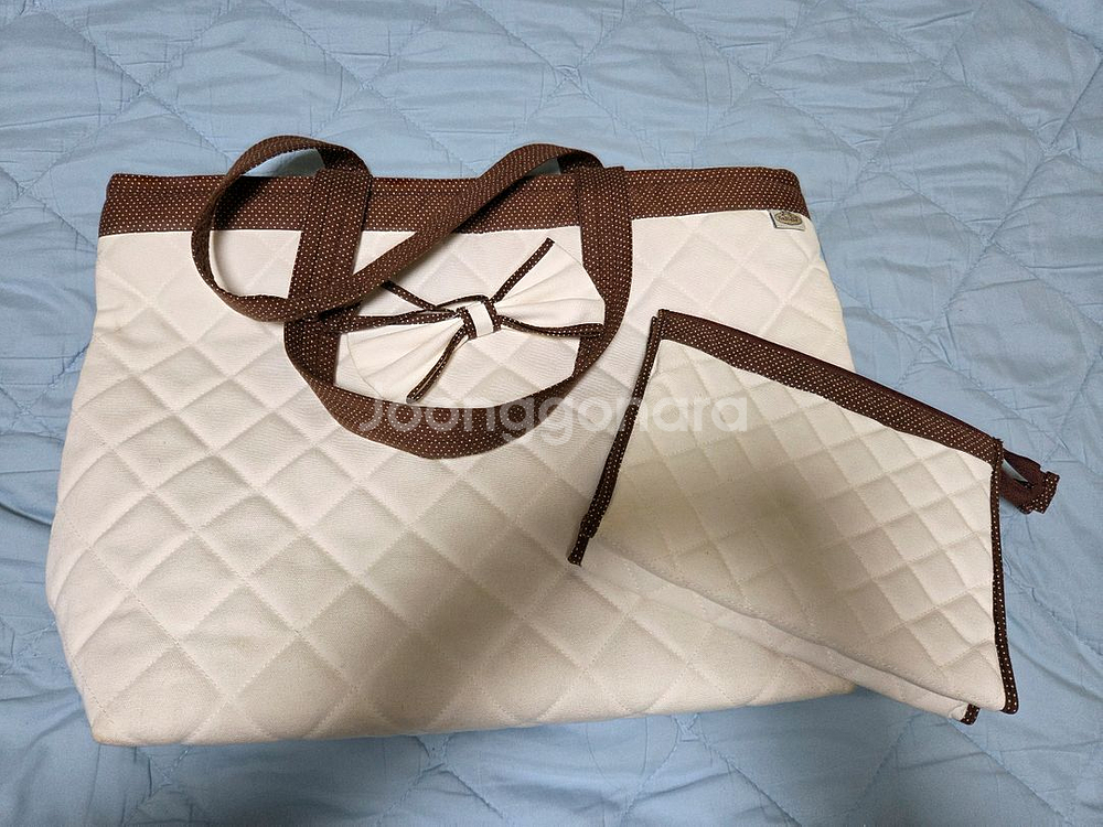 나라야 누빔 가방 & 파우치 세트 택포 2만원 기저귀 가방으로도 좋아요 약45cm x 30cm 크기 입니다 귀여운 누빔 가방과 파우치 세트입니다 흰색 바탕에 갈색 물방울 무늬 테두리가 포인트예요 내부에 수납공간이 분리되어 있어 편리합니다 상태는 사진과 같이 양호합니다