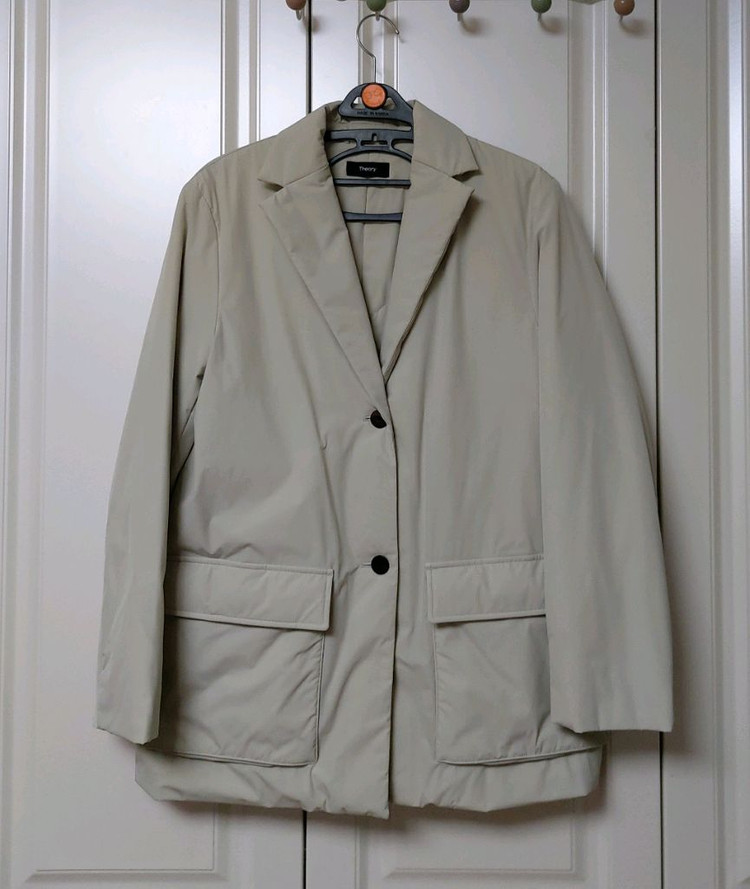 Theory 띠어리 경량 패딩 자켓 표기 0 사이즈. 가슴둘레 80cm 55사이즈 전체적으로 얇게 오리털로 채워진 경량패딩 디자인은 미니멀한 자켓형태라 세련되고 멋스러워요 가볍고 따뜻합니다 총장 73 가슴단면 49~50 cm 드라이완료 하자없이말끔합니다