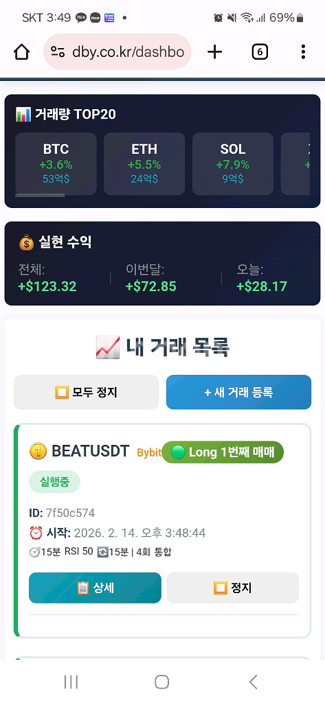 제 추천인으로 바이비트 가입해주시면 24시간 자동거래 프로그램 공유해드립니다. - 설치비 : 1만 5천원 _30분 소요. - 준비물 : 구글 아이디, 컴퓨터,바이비트 아이디(아래 링크로 회원 가입 후 연락) - 바이비트 회원 가입 링크 : https://partner.bybit.com/b/81895 - 카카오톡 친구 : DobbyM - 프로그램 사이트 : https://dby.co.kr/dashboard 간단한 셋팅으로 24시간 매크로처럼 거래하는 프로그램입니다. AI가 자동으로 거래 해주는건 아니고, 직접 전략 구상하시고, 설정하시면 24시간 계속 돌아가는겁니다. 장점 : 다수의 코인을 동시에 운영 가능, 24시간 운영 가능, 핸드폰으로 간단한 조작 ■주의 사항 본 프로그램은 투자 편의를 돕기 위한 보조 도구일 뿐, 수익을 보장하거나 특정 종목의 매수,매도를 권유하지 않습니다. 또한 모든 투자 판단의 최종 책임은 사용자 본인에게 있으며, 본 프로그램의 사용으로 인해 발생하는 투자 손실에 대해 운영사는 어떠한 법적 책임도 지지 않습니다. 커피값 편하게 벌려고 만든 프로그램이니, 가볍게 한번 써보세요.