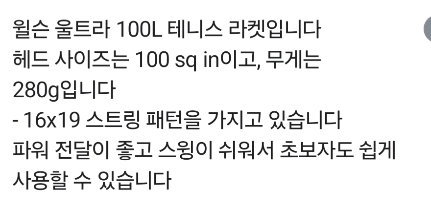 아동용 테니스 라켓이에요. 100L 용량으로 적당한 크기이고, 스트링 패턴도 깔끔하게 잘 되어있어요. 사용감은 있지만 상태 양호합니다.새상품 입니다.