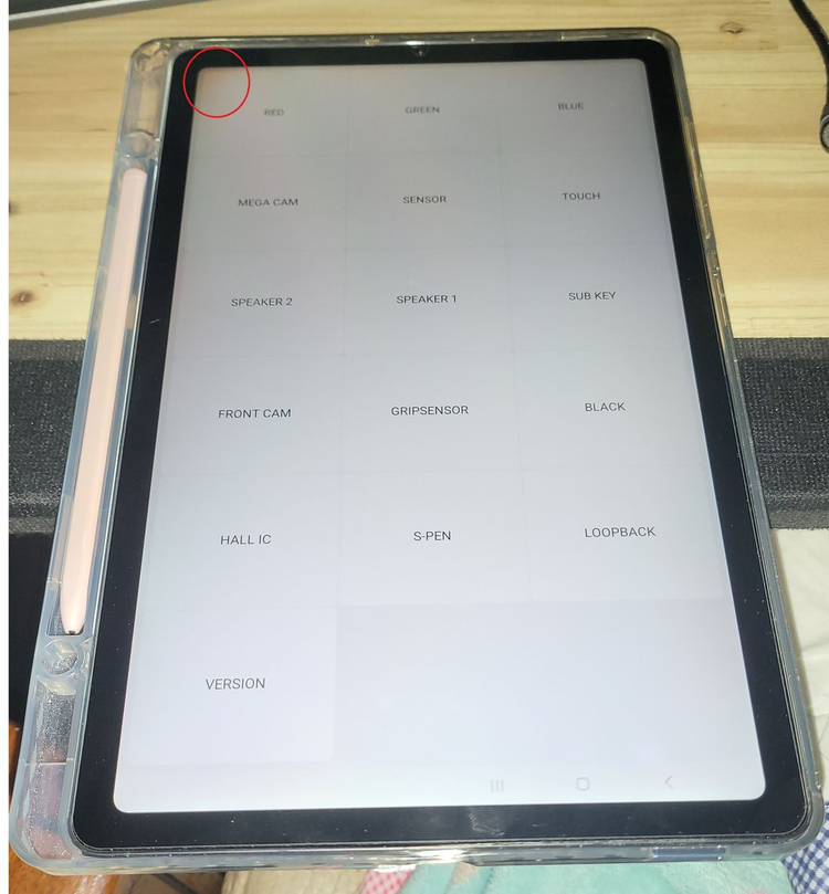 S6 LITE 64G WIFI 입니다. 큰 하자는 없지만 상단 동그라미 친 부분이 약간 머뭇하게 보여요. 화면 상단 잘 확인하시고, 중고이므로 반품, 환불 어려우니 잘 확인하세요. 화면의 S펜, 케이스 포함.