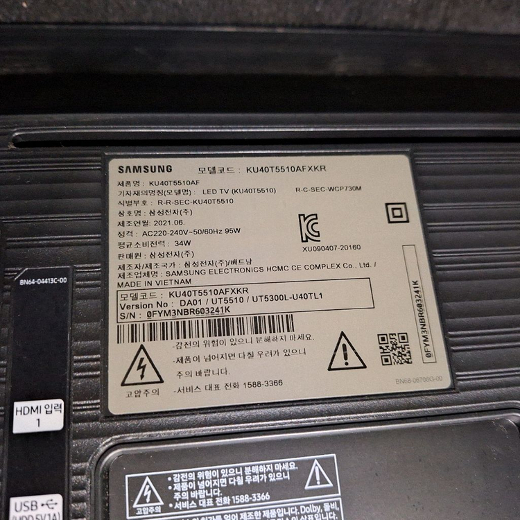 삼성 40인치 LED TV KU40T5510AFXKR 모델 판매합니다 - 에너지 소비 효율 1등급 제품입니다 - 평균 소비 전력은 34W입니다 - 슬림하고 세련된 디자인으로 인테리어 효과도 누릴 수 있습니다 - 생생하고 선명한 화질로 몰입감 넘치는 시청 경험을 제공합니다 - 2021년 6월 제조 호환용 리모컨 드립니다 마산 창원 진해